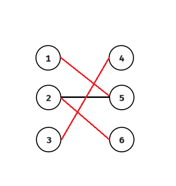 那么我们在这里先大概将一个匈牙利算法求最大匹配的流程:首先,我们找到一个点,然后随便找一条边,接着考虑,如果我们能找到一个路径,起点是未盖点,终点也是未盖点,中间经过的是已盖点。拿例图举个例子,如果我们一开始随便选了黑色的边,然后就可以找到 $1\rightarrow5\rightarrow2\rightarrow6$ 这样的路径,用 $1\rightarrow 5$ 和 $2\rightarrow6$ 替换 $5\rightarrow 6$ ,造成了 1 的价值。这样的路径被称为增广路。那么接下来就直接上代码。